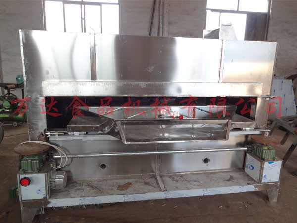 該機啟動加熱按鈕進行加熱,然后抽出平搖篩將花生放入爐內,啟動電機按鈕讓平搖篩在爐內搖動。待烘烤成熟后擺動搖擺主軸上的離合器手柄,使平搖篩停止擺動并將其拖出。打開出料口開關將花生倒出,然后把開關關閉,放入花生米,將其推入烤爐內,擺動離合器手柄使其擺動繼續工作。